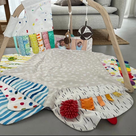 Play Gym settes opp på få minutter uten verktøy og inneholder flere avtakbare leker og kort som stimulerer nysgjerrighet og læring. Den kan også gjøres om til en liten lekehule når barnet blir eldre.