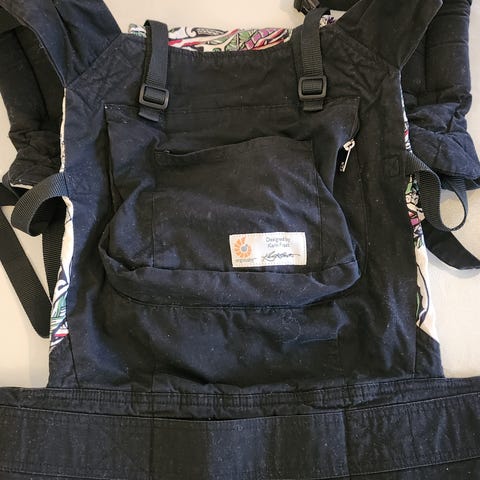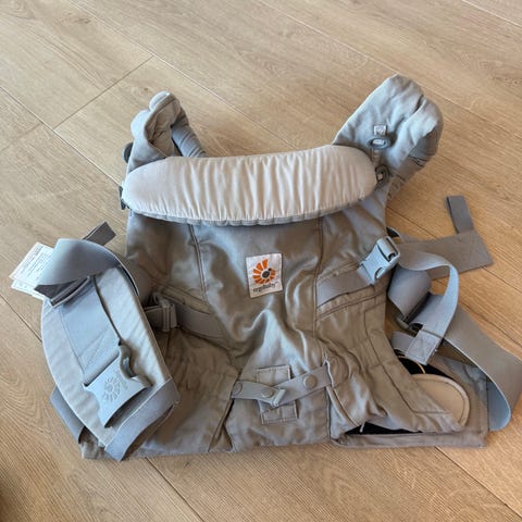 En eldre type av Ergobaby bæresele med hette i grått. Designet for komfort og støtte under bæring av barn.