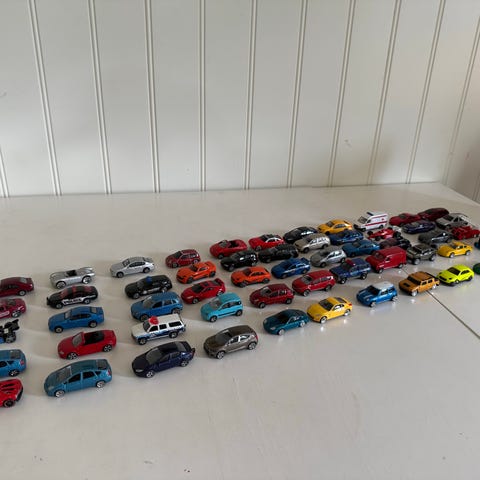 En kasse full med forskjellige lekebiler. Ca 150-200stk