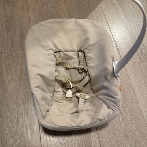 Stokke høy barnestol i hvit tre. Justerbar sitte- og fotplate for tilpasning etter barnets størrelse. Designet for barn, med solid konstruksjon som gir støtte og komfort.