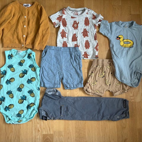 Klespakke med sommerklær i størrelse 86. I hovedsak brukt av en gutt, men noen plagg er brukt av jentene våre også. Kan være anmerkninger på noen av plaggene og noen er vasket mer enn andre.