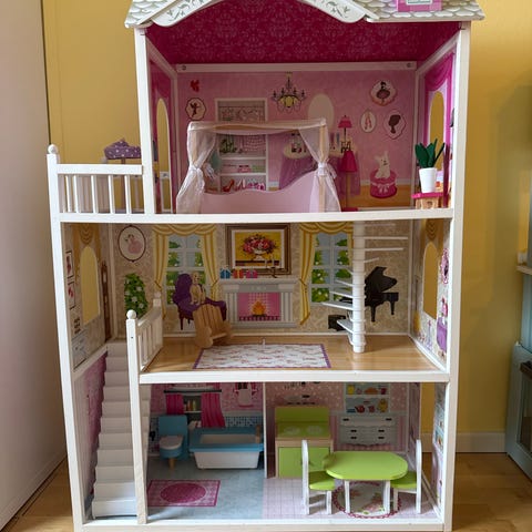 Dukkehus i tre med flere rom og medfølgende møbler. Dukkehuset har to etasjer og er utstyrt med ulike møbler som bord, stoler, seng og kjøkkenutstyr. Passer til barn som leker med dukker og rollespill.