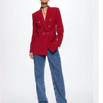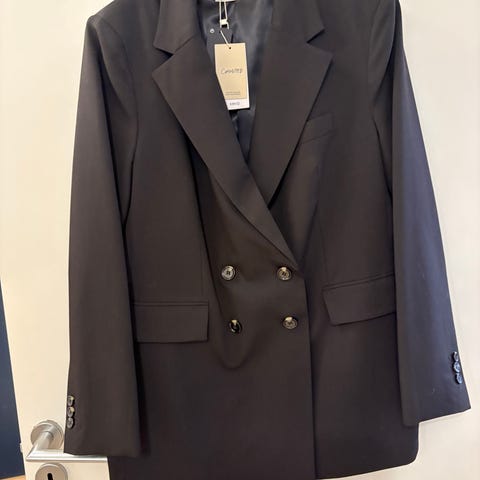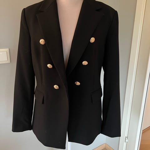 Mango dobbelspent blazer for kvinner, størrelse 4X. Jakken er svart og har et klassisk, luksuriøst design. Materiale og ytterligere detaljer er ikke spesifisert.
