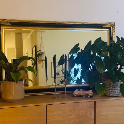 Rammen har noen skader/sprekker, særlig i ett hjørne (se bilder), men speilet er fullt brukbart og gir et flott uttrykk på vegg eller gulv.