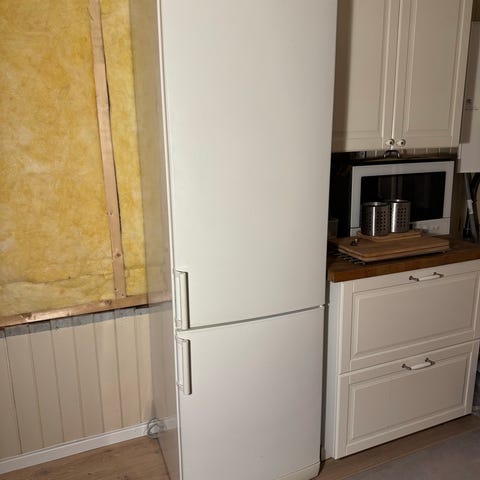 Siemens kombiskap med kjøle- og fryserdel. Brukt og fungerer som det skal. Det er en sprekk i én kjøleskapskuff og én fryserskuff (se teip på bildene), samt mangler en front til en seksjon i kjøleskapsdøren (se bilde). Alder er ukjent, da skapet fulgte med huset, men vi har brukt det i to år uten problemer. Selges fordi vi har gått over til et nytt, integrert kjøleskap. Må hentes i første etasje. Mål omtrent 60x60x183.