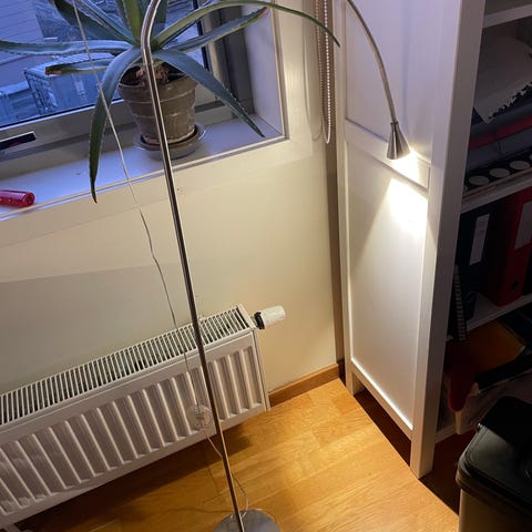 Gir varmt lys og har en praktisk switch under lampeskjermen.