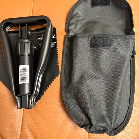 Feltspade og øks i hylster som kan festes til belte eller sekk.
