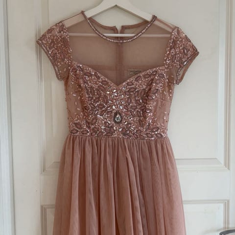 Vakker, kort selskapskjole fra Floyd. Kjolen er enkel i snittet, men med nydelige detaljer. Overdelen er overstrødd med nydelige stener, perler og paljetter. Lett chiffon over glatt underskjørt. Søt liten åpning med knapp i nakken, og smock rygg med god stretch. Vattert cup. Matchende sjal medfølger. En vakker, dyplilla farge.