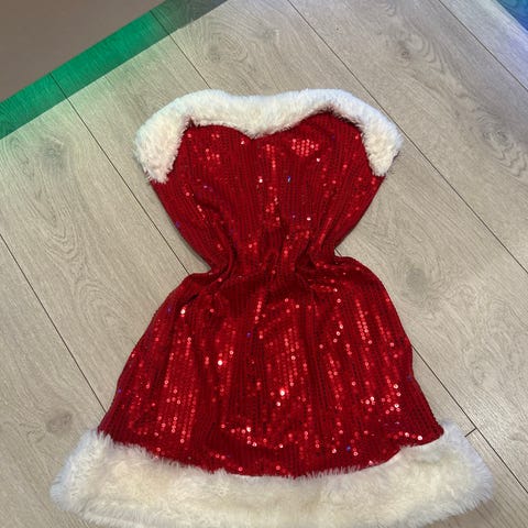 Kjolen er pent brukt. Den er i str. 10, som ifølge Floyds størrelsesguide tilsvarer str. 38/M. Brystmål fra armhule til armhule er 36 cm (ustrukket med mye å gå på), livvidde fra side til side er 34 cm og hel lengde fra skulder og ned er 100 cm. Kjolen er i 100% polyester, mens foret er i 97% polyester og 3% elastan.