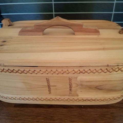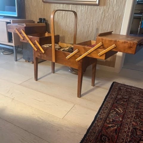 Treverk sykommode med flere rom og sammenleggbare seksjoner. Kommoden har en bærbar håndtak i midten og er designet for oppbevaring av syutstyr eller små gjenstander. Den har en klassisk design med ben og flere lag for organisering. Den trenger litt kjærlighet som pussing og oljing.