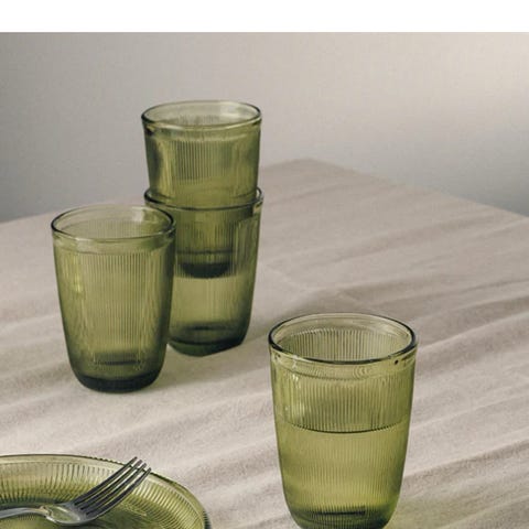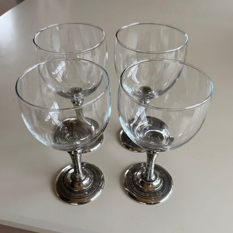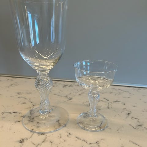 Hadeland Glassverk glass i klart glass. Glassene har stilisert design og er egnet til servering av drikke.