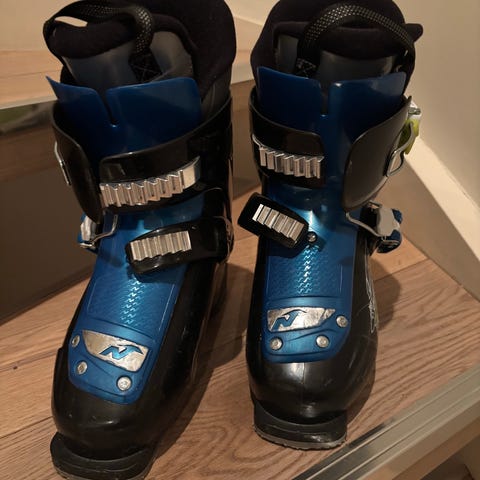 Nordica skistøvler med størrelse 280 mm, i hvit og lilla farge. Støvlene har fire spenner for justering og støtte. Egnet for alpinski. Masse bruk i igjen.