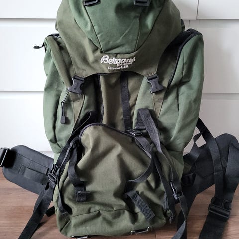 Har bruksmerker, men er i god stand. Alle glidelåser og hemper er i orden og selve stoffet har mange flere turer i seg. Trenger en runde med impregneringsspray om du skal ut å gå i regnvær, men sekken har også innebygget regntrekk.