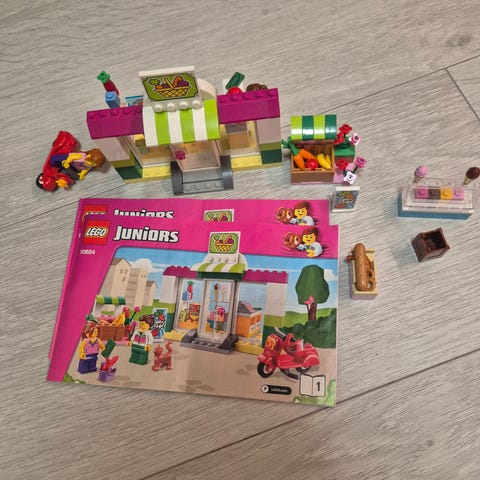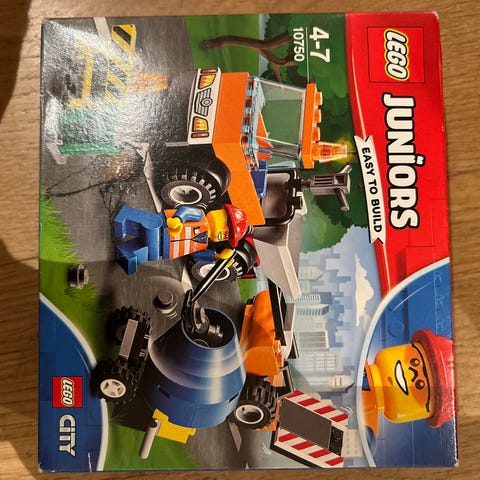 LEGO Juniors lekesett som inkluderer en søppelbiler i grønn og hvit farge, samt minifigurer. Settets design er tilpasset barn i alderen 4-7 år og er laget for enkel bygging med store klosser.