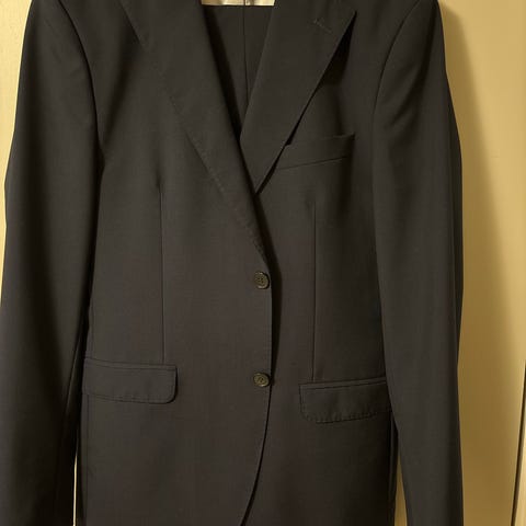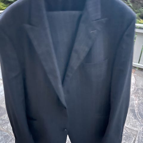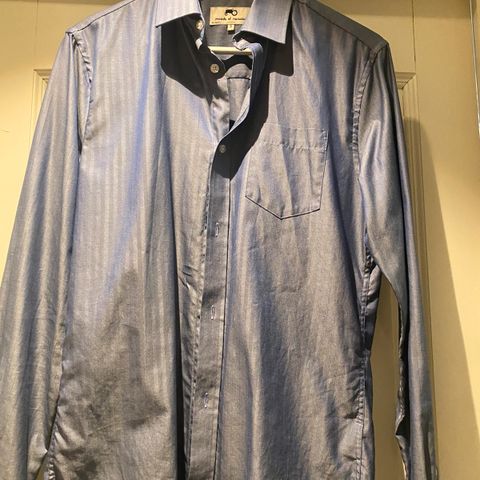 Blå/svart melert dress. Hull bak på høyre arm som er sydd igjen. Ellers pen.