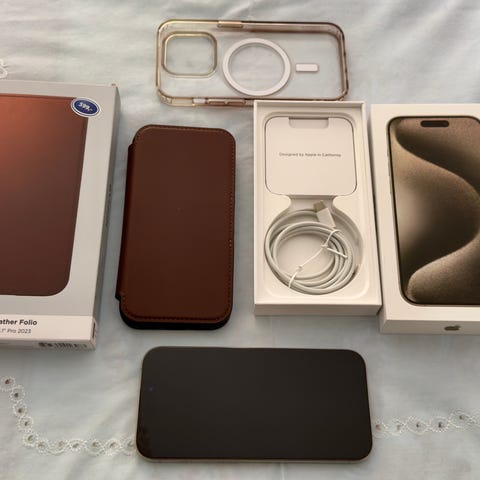 Selger en iPhone 15 Pro (128 GB) i elegant Natural Titanium-farge. Telefonen er i meget god stand og fungerer helt feilfritt.