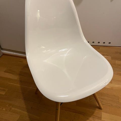 8 stk hvite Eames DSW-replikastoler. Stødige og lite brukt. Selges pga flytting. Må hentes før 6.januar. 400 kr per stol. Selges samlet kr 2800 (du betaler for 7 stoler).