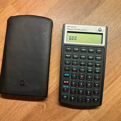 HP 10bII+ finansregner med numerisk tastatur og LCD-skjerm. Enheten er beregnet for økonomiske beregninger og har funksjoner for blant annet renter, betalinger og investeringer.