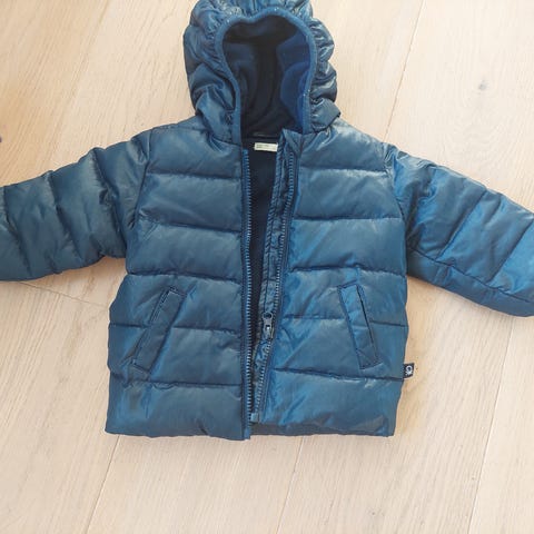 Benetton Baby jakke i størrelse 74 for jente. Jakken har et mønster med hvite prikker på mørk bakgrunn og er foret på innsiden. Egnet for små barn.