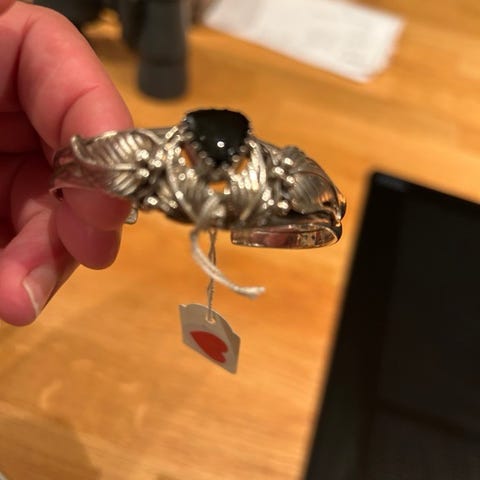 Anheng i metall og noe jeg tror kan være tigerøye