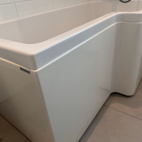 Sidepanelet er av PVC og har gulnet noe. Sidepanelet kan kanskje lakkeres eller folieres hvis en ønsker å bedre det visuelle uttrykket. Badekaret kan brukes med sidepanelet eller f.eks. flises inn.