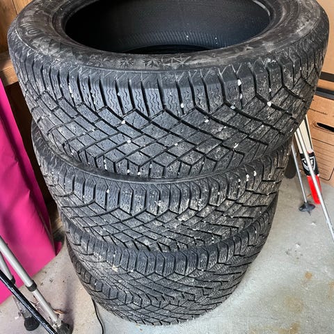 Komplett sett med piggfrie vinterdekk på fine felger selges