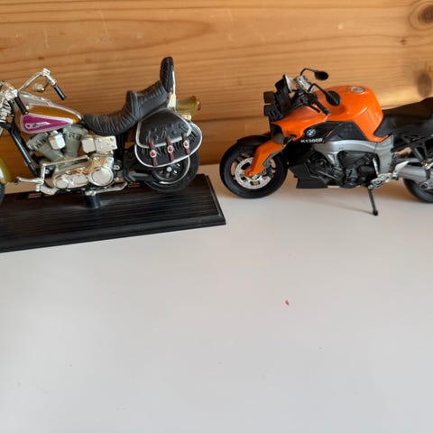 Sidevogn laget i metall med plastdetaljer. Motorsykkel og fører er i plast. Fremstår som godt brukt.