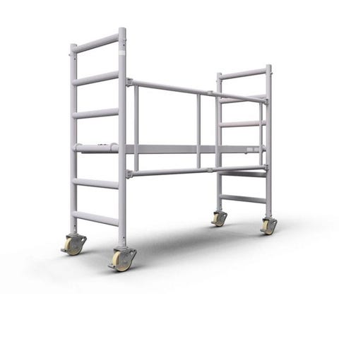 Stillasset er enkelt og raskt å montere, leveres med hjul med brems, plattform i kompositt og rekkverk på toppen for god sikkerhet.