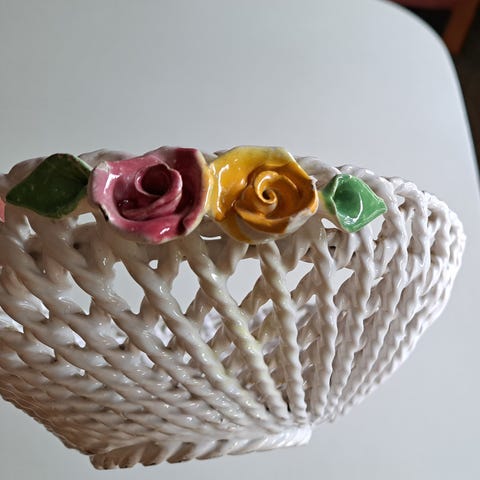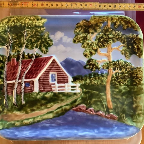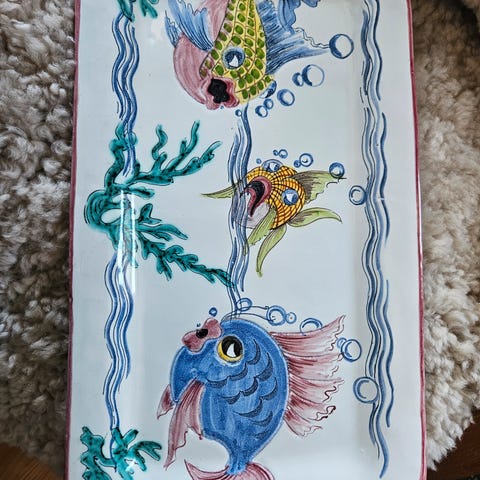 To keramiske fat med malte motiver fra Venezia. Fatene har rektangulær form og viser bylandskap med kanaler og gondoler. Fargene er hovedsakelig blå, rosa og beige.