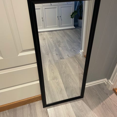 IKEA speil med oppbevaringsfunksjon for smykker. Speilet har hvit ramme og dør med hengsler som åpnes for å avsløre flere kroker og hyller til oppbevaring av smykker og småting. Passer til veggmontering og gir en kombinert funksjon av speil og smykkeoppbevaring.
