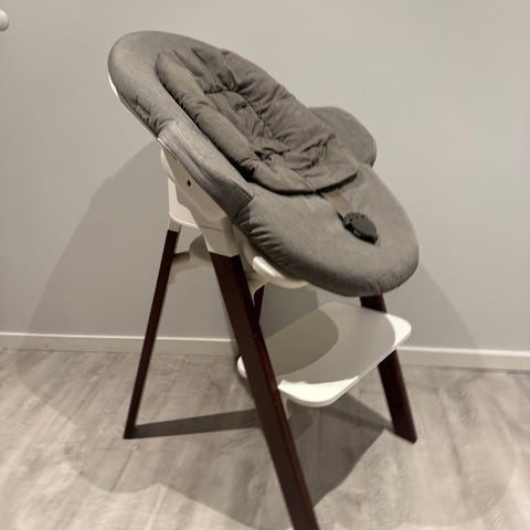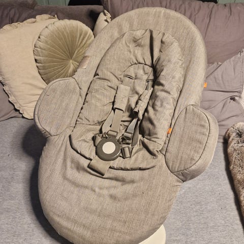 Stokke steps bouncer vippestol med babyinnlegg. Høyden (om babyen sitter eller ligger) kan justeres. Trekket kan tas av og vaskes