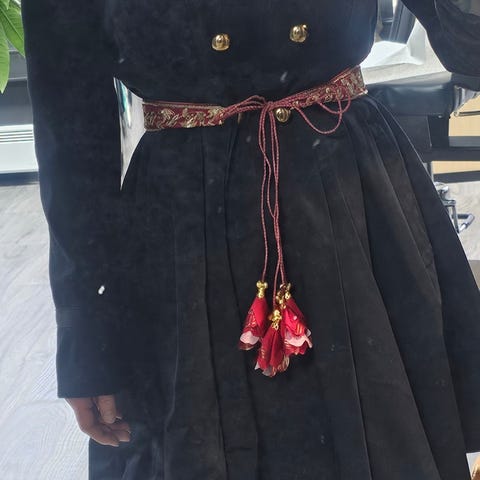 Lappen henger på. Det står størrelse 34, men passer meg i medium. Kan passe mindre størrelser også ettersom hvordan man ønsker at den sitter. Flatterende og nydelig passform. Kjøpt på Qomo, Storo for 3000,-