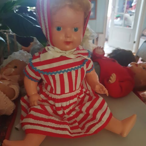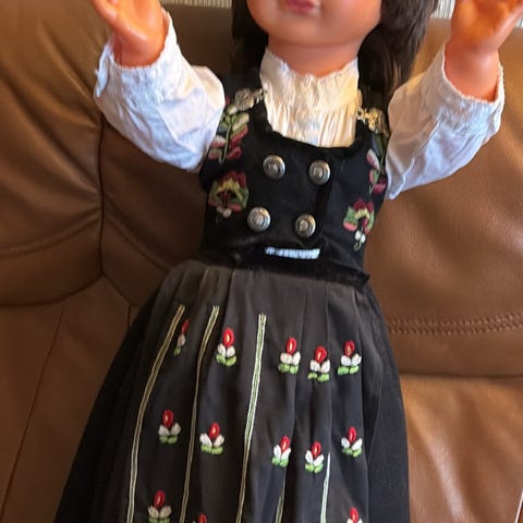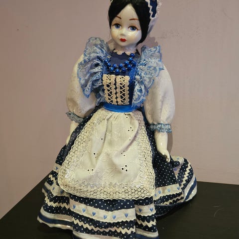 Dukker med ulike bunader. Dukkene har stått i eske på en hylle og aldri blitt lekt med. Fremstår som ny. Pris er per stk.