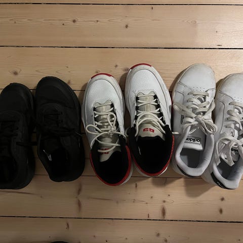 Adidas barnesko i størrelse 36 2/3. Nike og Air Jordan størrelse 37,5. Alle sko er unisex.