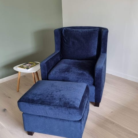 To stk lenestoler og en puff i mørk blå velur i serien Conrad fra Sofa Company.