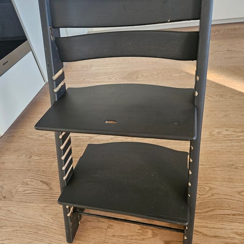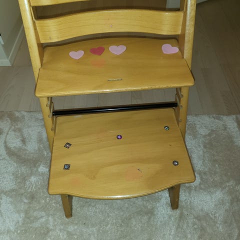 Stokke høy barnestol i tre, lys grønn farge kjøpt i 2021. Barnestolen har justerbar sitte- og fotplate for tilpasning til barnets størrelse. Stolen har noe bruksmerker, men ingenting sjenerende. Trenger en vask, men er ellers god som ny.