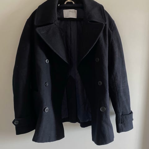 Polyester og ull. Seks knappers. Tre lommer. Ingen feil eller mangler.