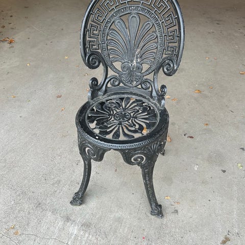 Klassisk cafe bord med nyere 3 fots støpejern understell med gummi knotter under. Grønn marmor plate med noen minimale hakk den er enkel og skru av ved frakt. Bordet er tungt og stødig.
