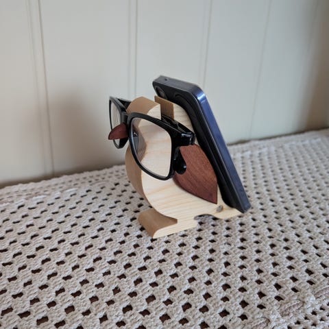 Brille- og mobilholder laget av tre og mahogni. Designet for å holde briller og mobiltelefon på en praktisk måte. Passer til ulike størrelser av briller og mobiltelefoner. Naturlig farget treverk med kontrasterende mahogni detaljer.