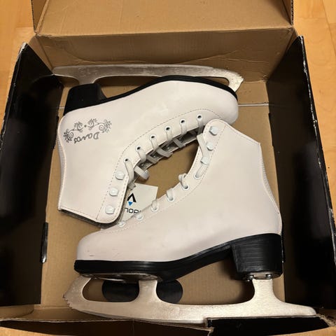 Safine skøyter i størrelse 34. Skøytene er hvite og designet for skøytedans. De har tradisjonell snøring og metallblad for is.