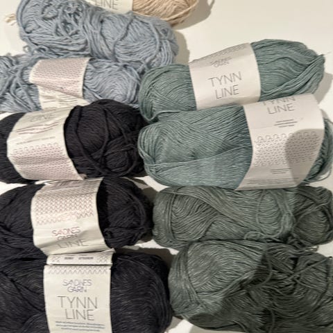214 g Tynn line fra Sandnes garn selges. 6 nøster med ulik vekt kjøpt på fabrikkutsalget. Farge mørk blågrå 6061.