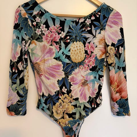 Vintage body topp med blomster / maleri motiv, størrelse ca medium, merke Kosinski. Passformen ser ut til å være 90-talls