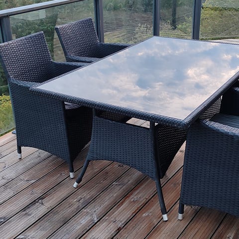 Glassbord med fire stoler laget i rottingmateriale. Bordet har en glassplate og stolene har høy rygg. Settet er designet for utendørs bruk, egnet for balkong eller terrasse.