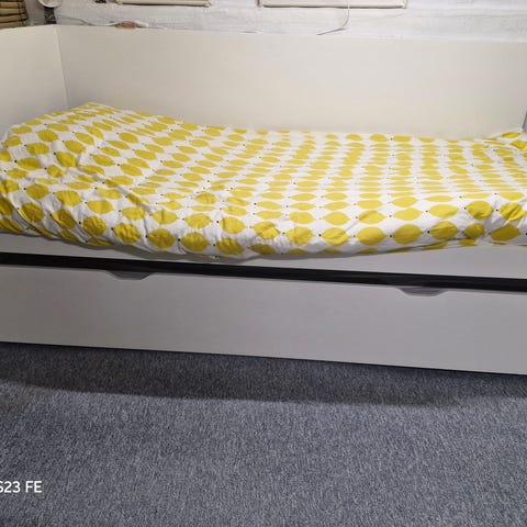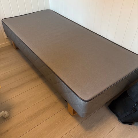 Beige smijernsseng fra Jysk med hjerteutsnykning selges med sengebunn, men uten madrass. Passer til 90x200 og 90x210 madrass. Som ny. Må hentes.