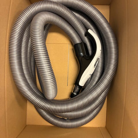 Villavent sentralstøvsuger med tilhørende slanger og munnstykker. Enheten er montert på vegg og designet for fast installasjon i bolig. Passer til rengjøring av større arealer med sentralstøvsugersystem.