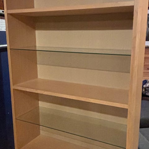 Godt brukt billyhylle fra Ikea med 6 hyller, i kirsebær. Har noen skraper på siden, så passer fint i en bod.