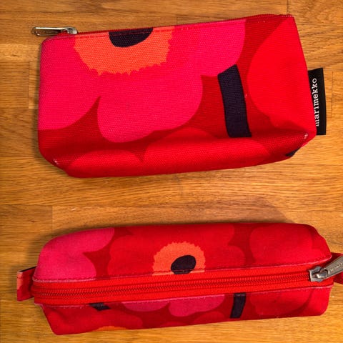 Kjempe søt, liten pung fra Marimekko i fargene mørkeblå/krem/beige. I det tradisjonelle mønsteret unikko.