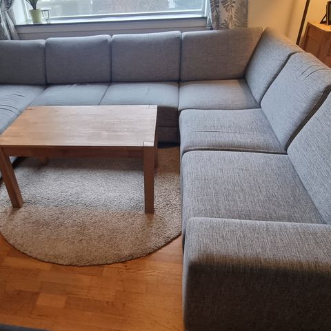 Selger en romslig og veldig behagelig hjørnesofa i grått stoff + 2 seter. Sofaen er dyp, myk og har god plass til hele familien. Den perfekte sofaen for filmkvelder!