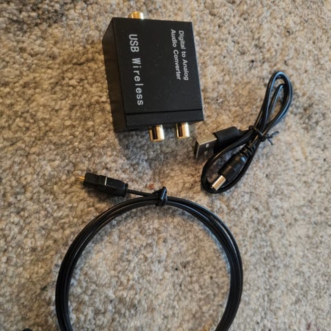DAC nypris ca kr 500,-Optisk inn RCA ut. 2 m Optisk kabel fra wire world (Nova) nypris ca 800,-