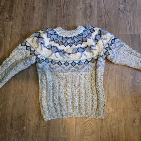 Beautifully hand knit wool sweater. Heavier pull and can be worn without a jacket on cold winter days!